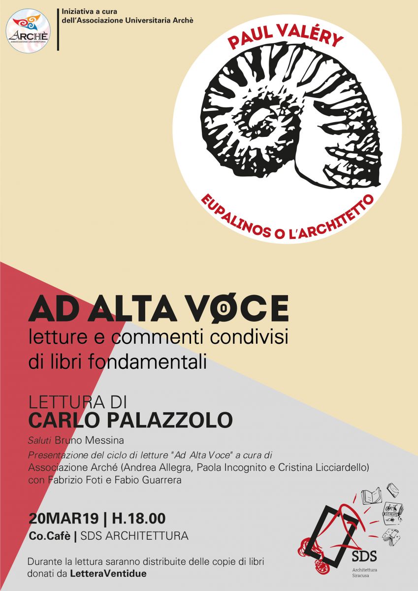 AD ALTA VOCE#0 LETTURA DI CARLO PALAZZOLO | Eupalinos o l'architetto di Paul Valéry Mercoledì 20 marzo 2019 alle ore 18.00, Co.Cafè, SDS Architettura Siracusa. AD ALTA VOCE | letture e commenti condivisi di libri fondamentali. Condividi Facebook Twitter Whatsapp Telegram Email