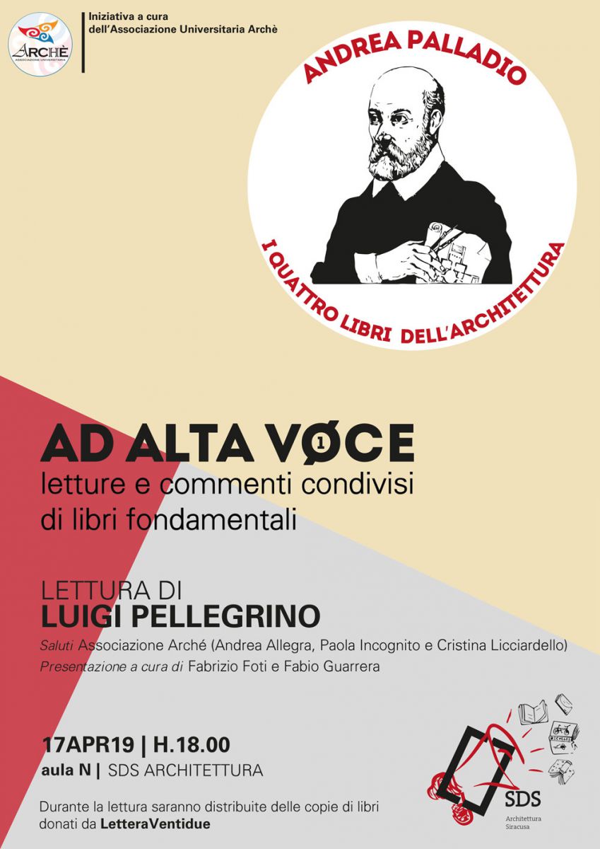 AD ALTA VOCE#1 LETTURA DI LUIGI PELLEGRINO | I quattro libri dell'architettura di Andrea Palladio Mercoledì 17 aprile 2019 alle ore 18.00, Aula N, SDS Architettura Siracusa. AD ALTA VOCE | letture e commenti condivisi di libri fondamentali. Condividi Facebook Twitter Whatsapp Telegram Email