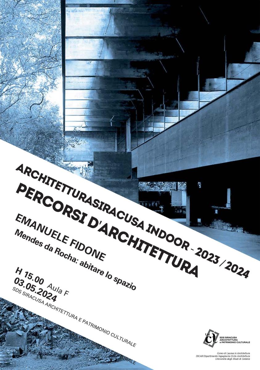 ARCHITETTURASIRACUSA INDOOR - 2023 / 2024 | PERCORSI D'ARCHITETTURA EMANUELE FIDONE | Mendes da Rocha: abitare lo spazio Venerdì 3 MAGGIO 2024, ore 15.00 Aula F, SDS Siracusa Architettura e Patrimonio Culturale. Documenti utili Scarica la locandina Condividi Facebook Twitter Whatsapp Telegram Email