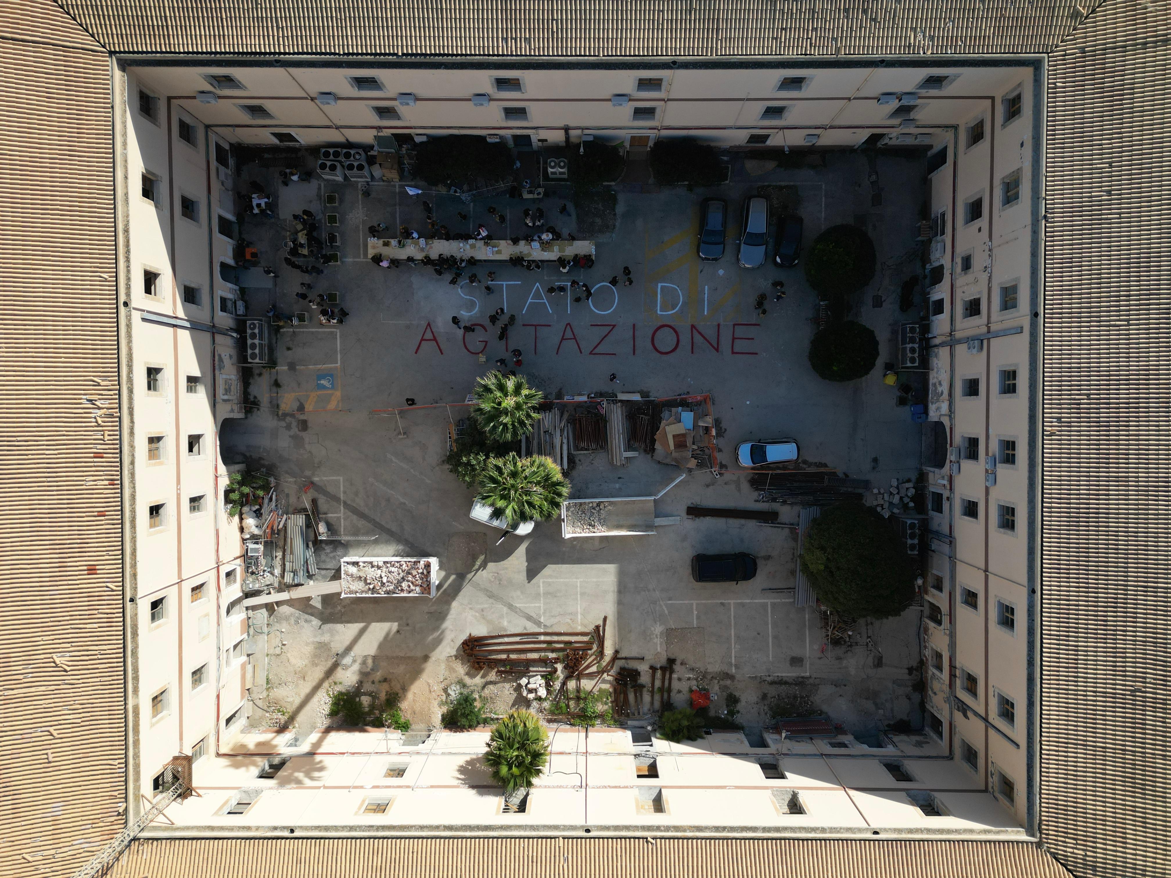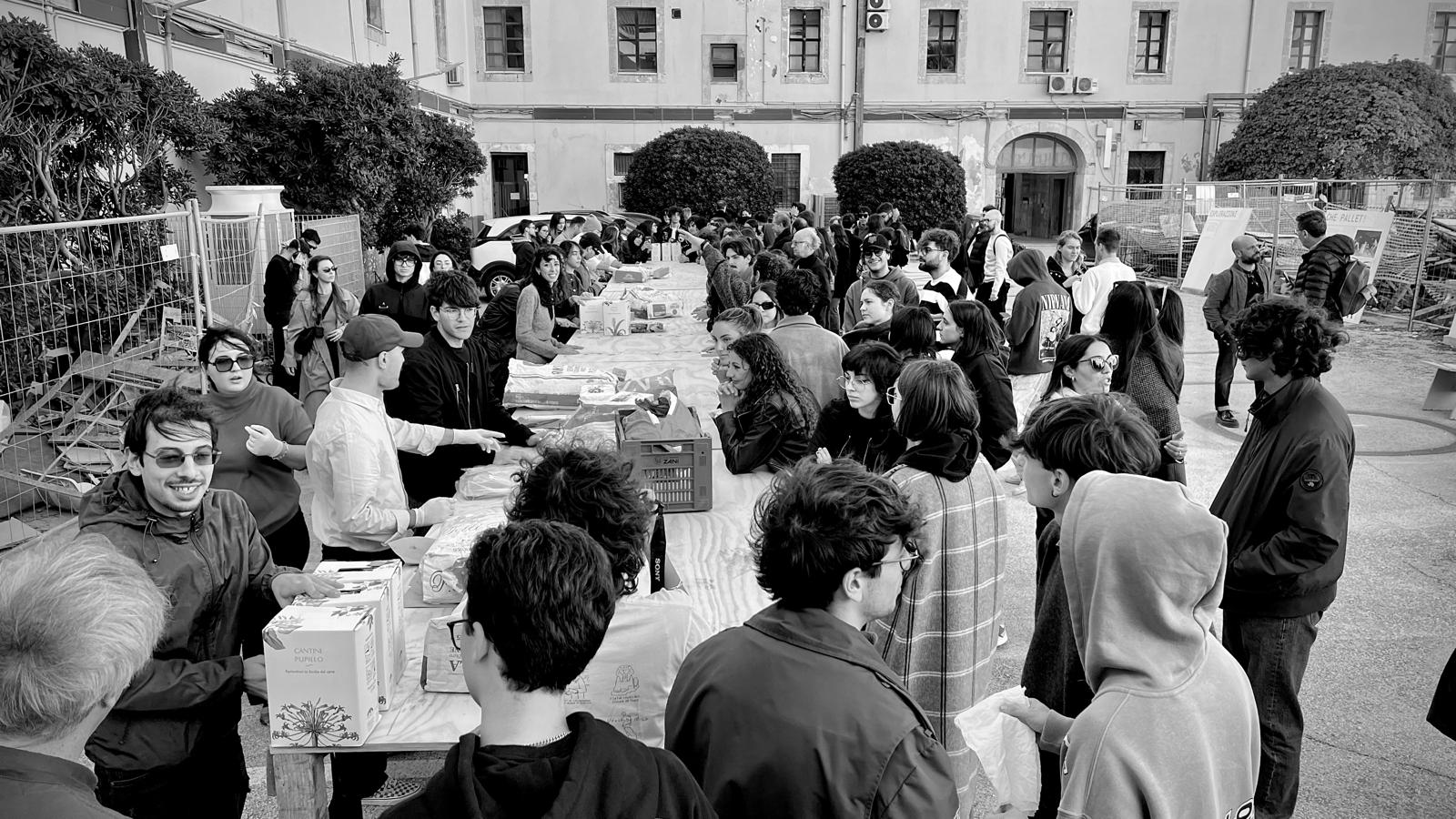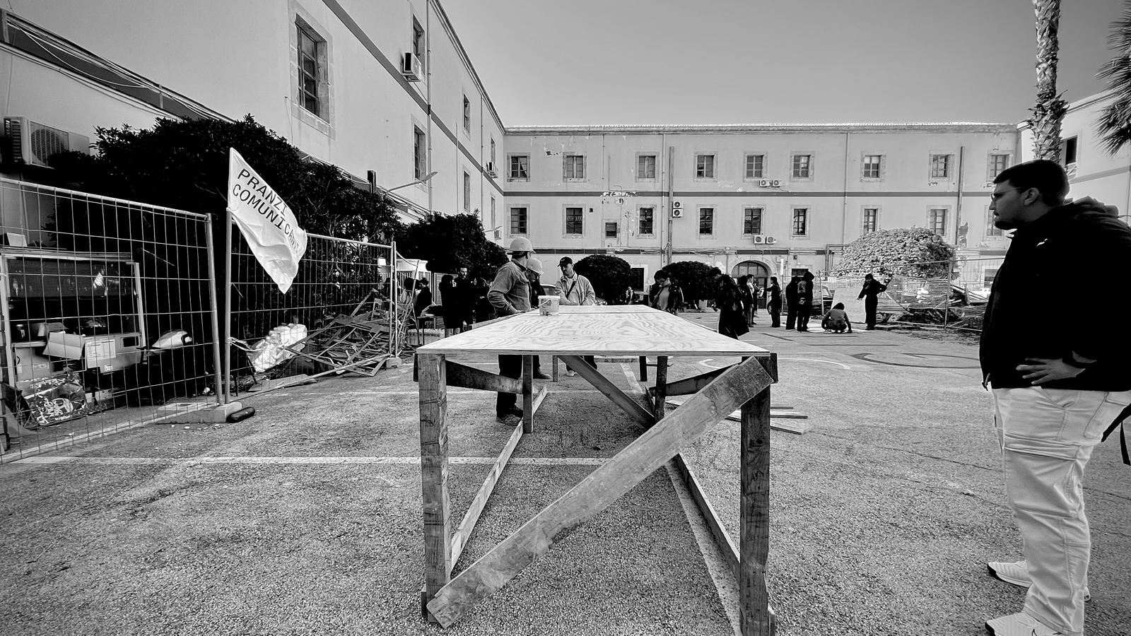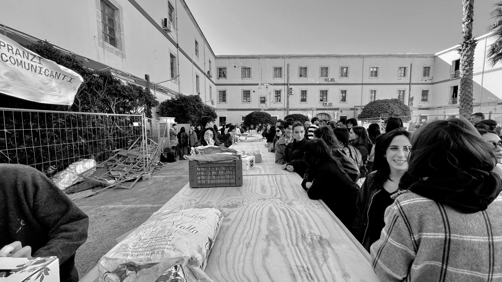 La giornata di protesta civile è stata un’occasione per sperimentare forme d’uso futuri dell’ampio cortile della caserma, attualmente oggetto di lavori di ristrutturazione. Uno stato di agitazione, come si legge dalla grande scritta impressa sulla pavimentazione del cortile, che manifesta la condizione di preoccupazione e di dissenso dei partecipanti, ma anche una mobilitazione positiva e propositiva, quella della comunità universitaria di Siracusa che si è unita per interrogarsi, in un conviviale “pranzo comunicante”, sulle possibili configurazioni spaziali e sulle pratiche sperate che possono incidere nella configurazione spaziale della propria sede.