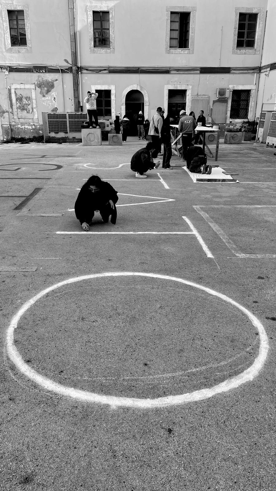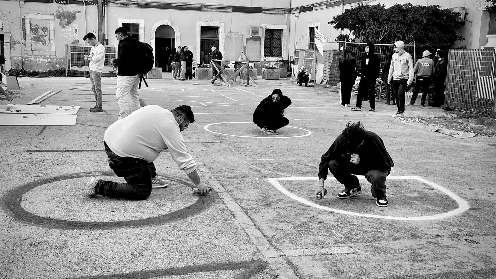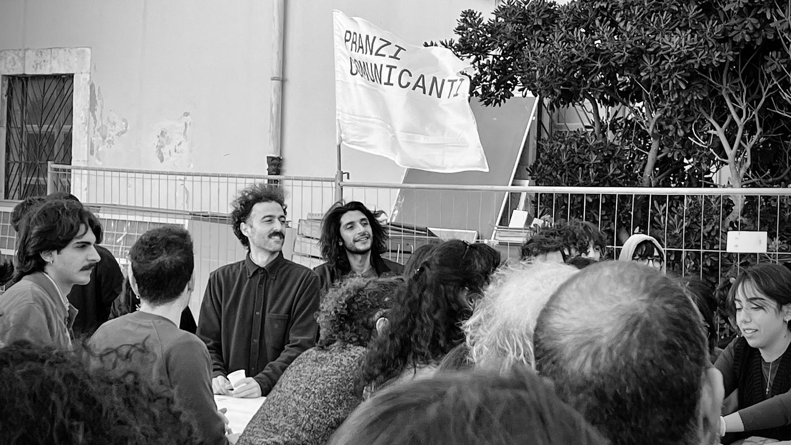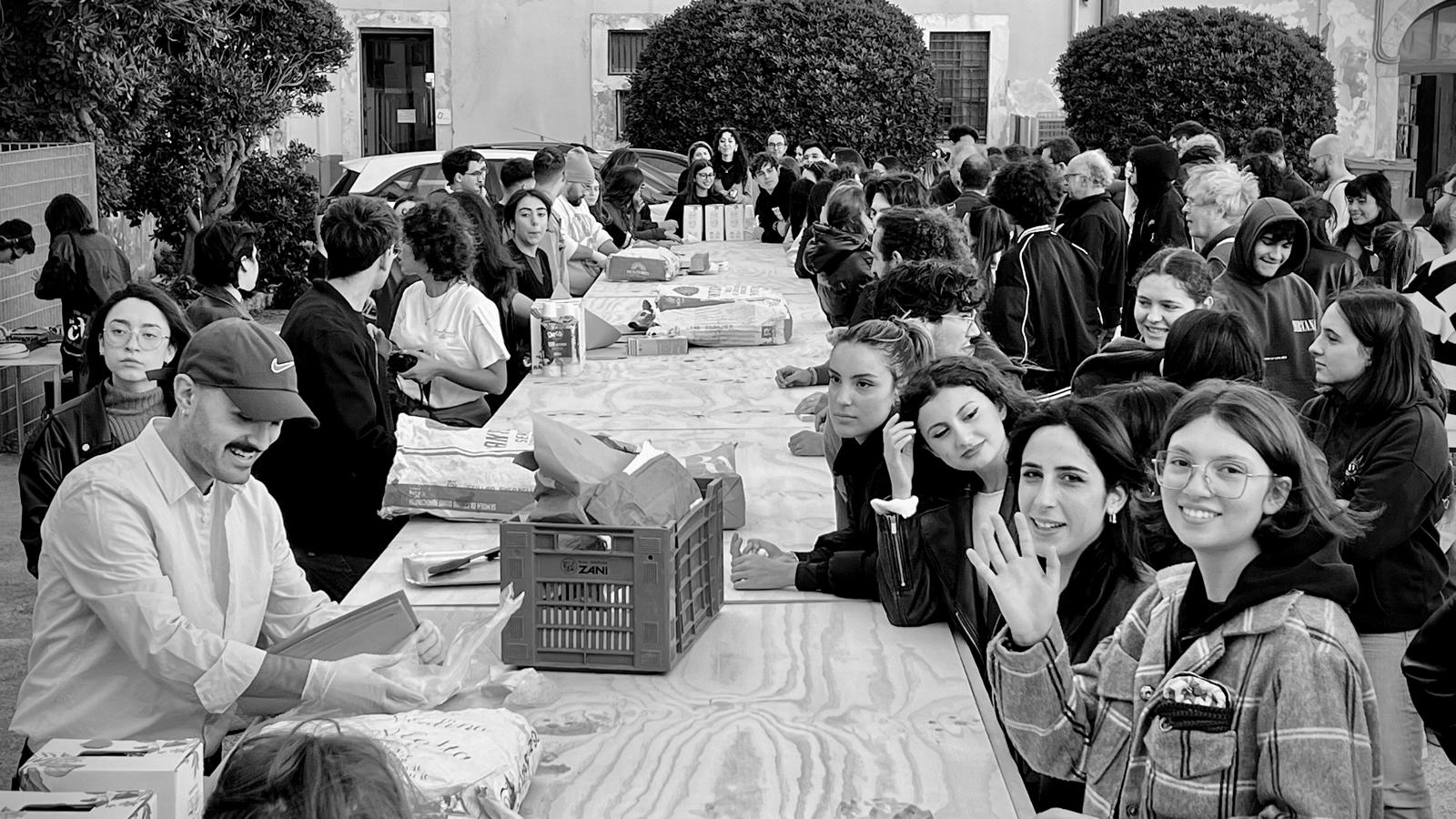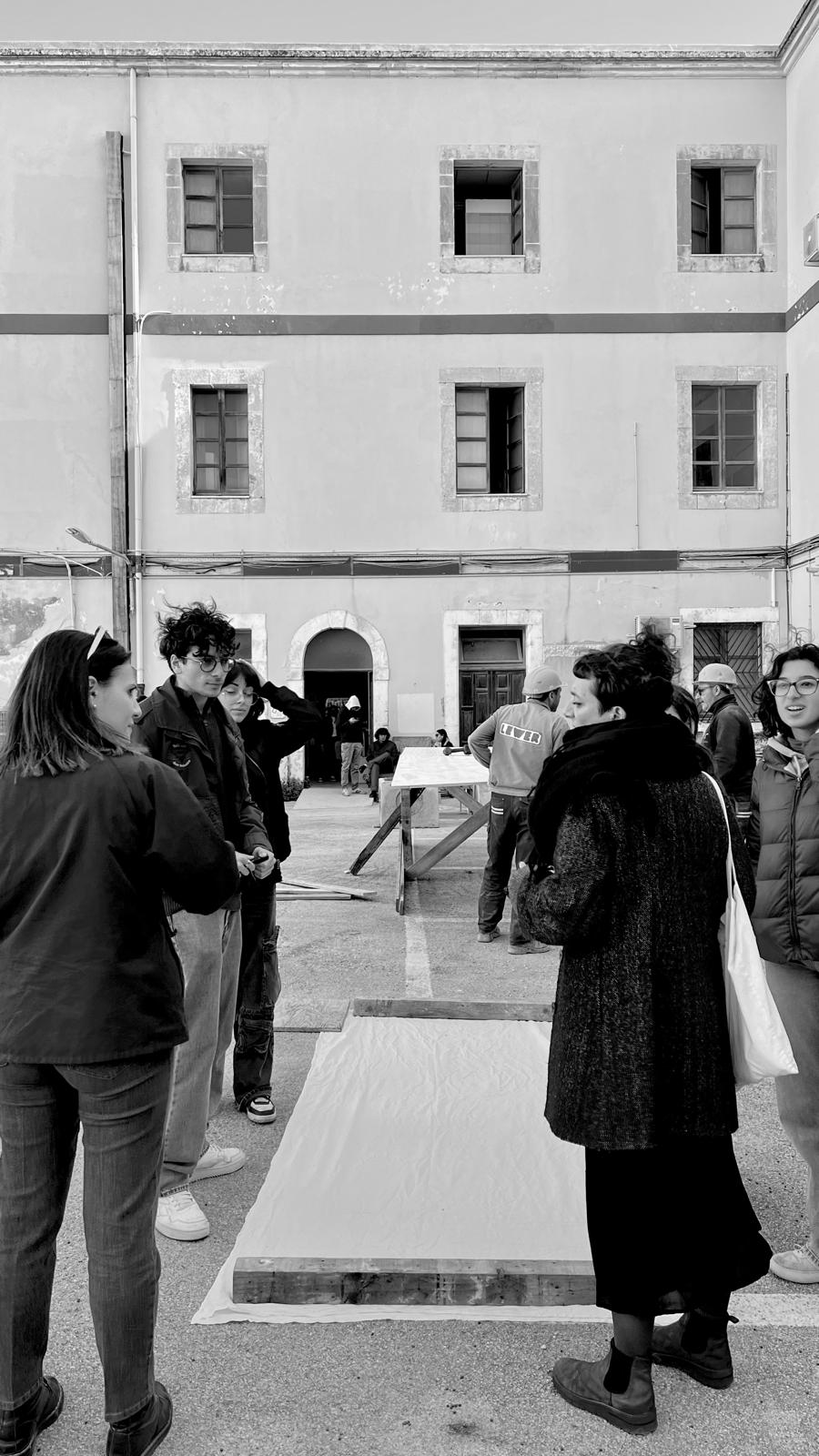 La giornata di protesta civile è stata un’occasione per sperimentare forme d’uso futuri dell’ampio cortile della caserma, attualmente oggetto di lavori di ristrutturazione. Uno stato di agitazione, come si legge dalla grande scritta impressa sulla pavimentazione del cortile, che manifesta la condizione di preoccupazione e di dissenso dei partecipanti, ma anche una mobilitazione positiva e propositiva, quella della comunità universitaria di Siracusa che si è unita per interrogarsi, in un conviviale “pranzo comunicante”, sulle possibili configurazioni spaziali e sulle pratiche sperate che possono incidere nella configurazione spaziale della propria sede.