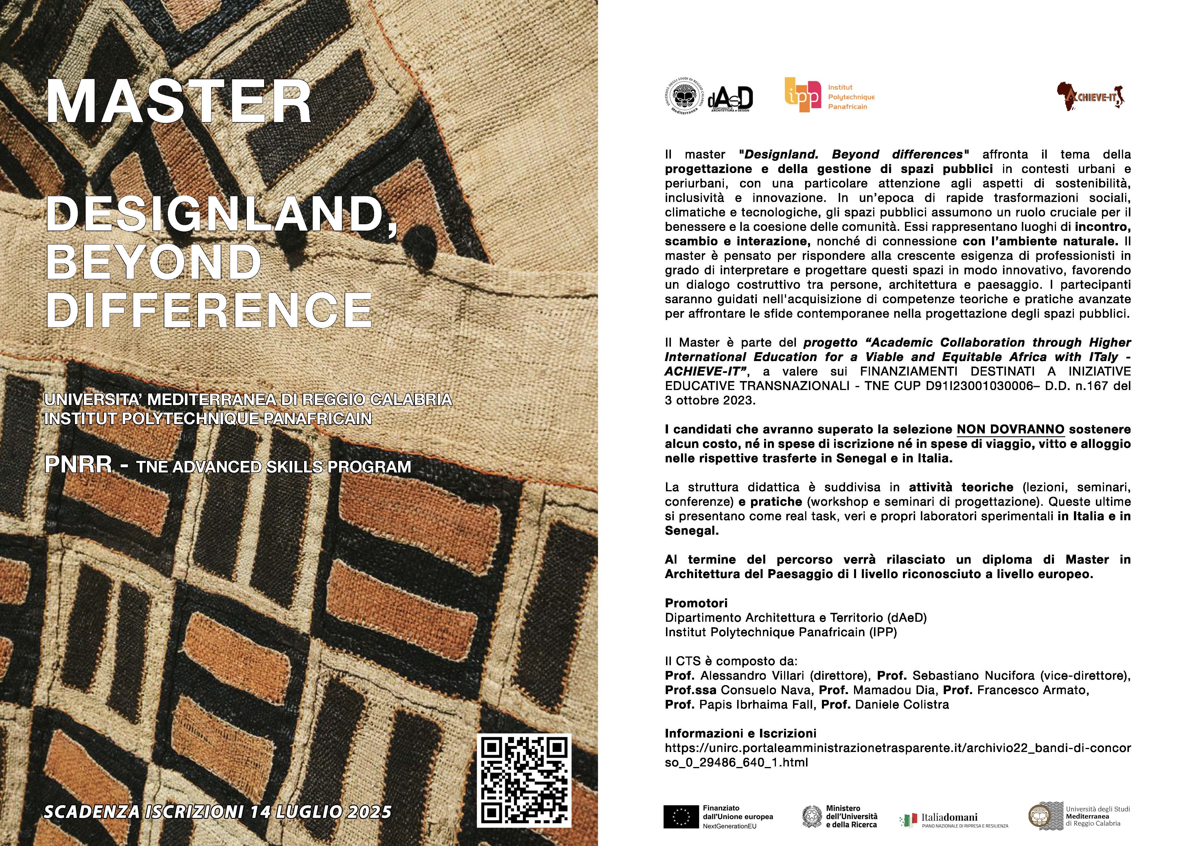 DESIGNLAND, BEYOND DIFFERENCE Master universitario di I livello in “Designland. Beyond differences, in collaborazione con l’Institute Polytecnique Panafricain (IPP) di Dakar in Senegal. Allegati Scarica la locandina del MasterLink utiliInformazioni e iscrizioni Data di pubblicazione: 07/07/2025 Condividi Facebook Twitter Whatsapp Telegram Email