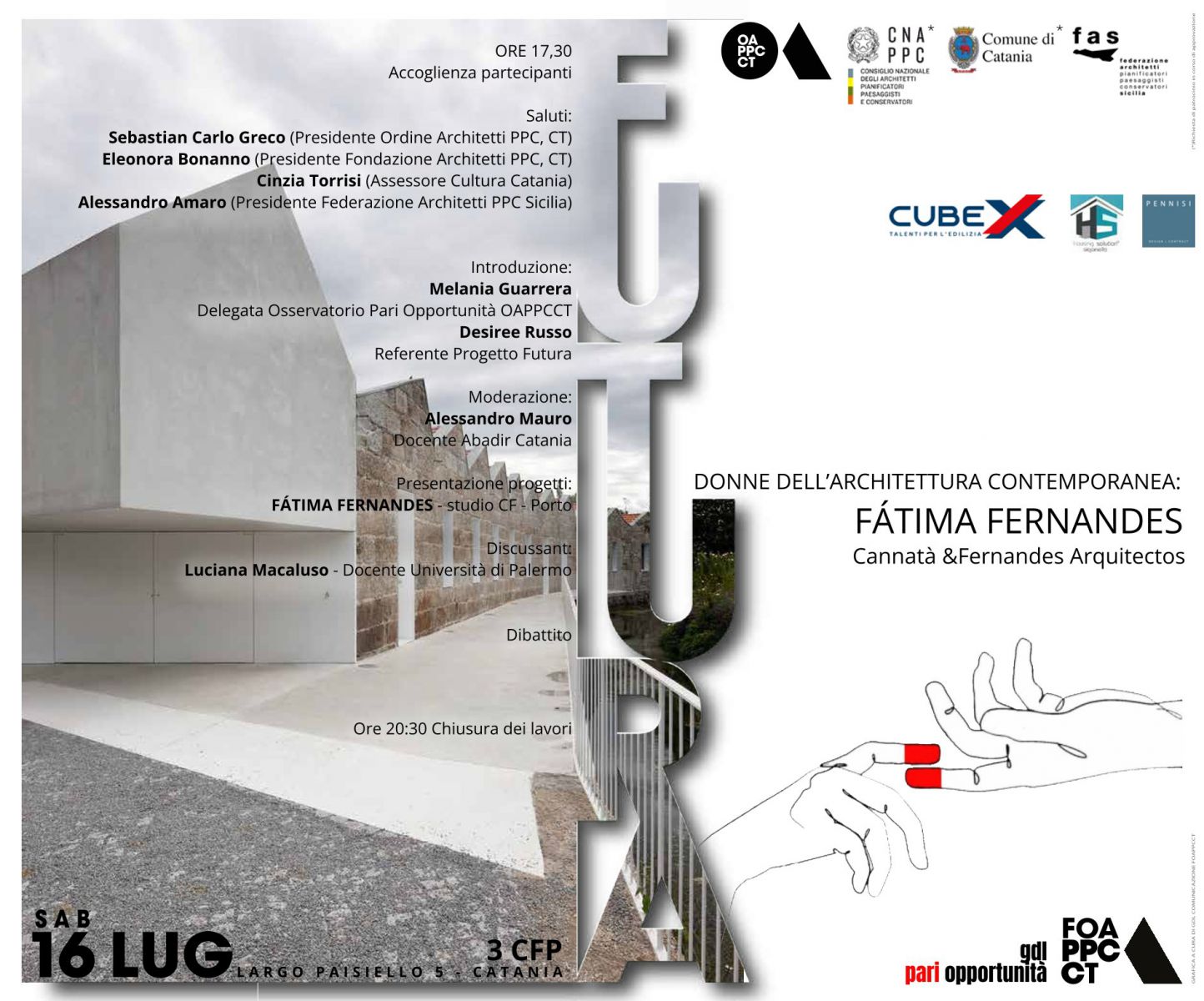 La Fondazione Architetti Catania, e l’Ordine degli Architetti PPC Catania – e con il patrocinio del Comune di Catania – per il ciclo “Futura. Donne per l’Architettura contemporanea”, sabato 16 Luglio, dalle 17:30, presso la sede dell’Ordine degli Architetti di Catania, ospiterà Fátima Fernandes, dello studio Cannatà & Fernandes arquitectos. Modera Alessandro Mauro, Discussant prof.ssa Luciana Macaluso.