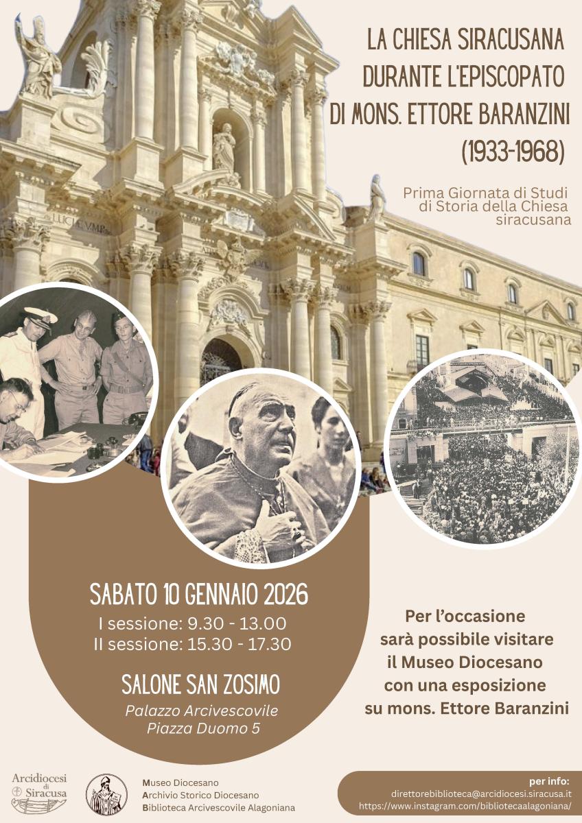 Sabato 10 gennaio, nel salone “San Zosimo” del Palazzo Arcivescovile, prima Giornata di studi di Storia della Chiesa siracusana. Due sessioni, una al mattino ed una al pomeriggio, nel corso delle quali si alterneranno numerosi relatori che rifletteranno sul tema “La Chiesa siracusana durante l’Episcopato di mons. Ettore Baranzini (1933-1968)”.
