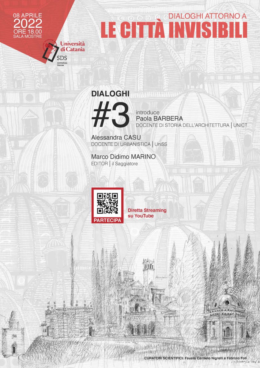 LE CITTÀ INVISIBILI_DIALOGO#3 DIALOGO #3/08.04.2022 con Alessandra Casu (UNISS) e Marco Didimo Marino (ilSaggiatore). Introduce Paola Barbera. Ore 18.00 Spazio Mostre SDS Architettura Siracusa. SEGUI LA DIRETTA SU YOUTUBE Link utiliPagina dedicata alliniziativa Data di pubblicazione: 01/04/2022 Condividi Facebook Twitter Whatsapp Telegram Email